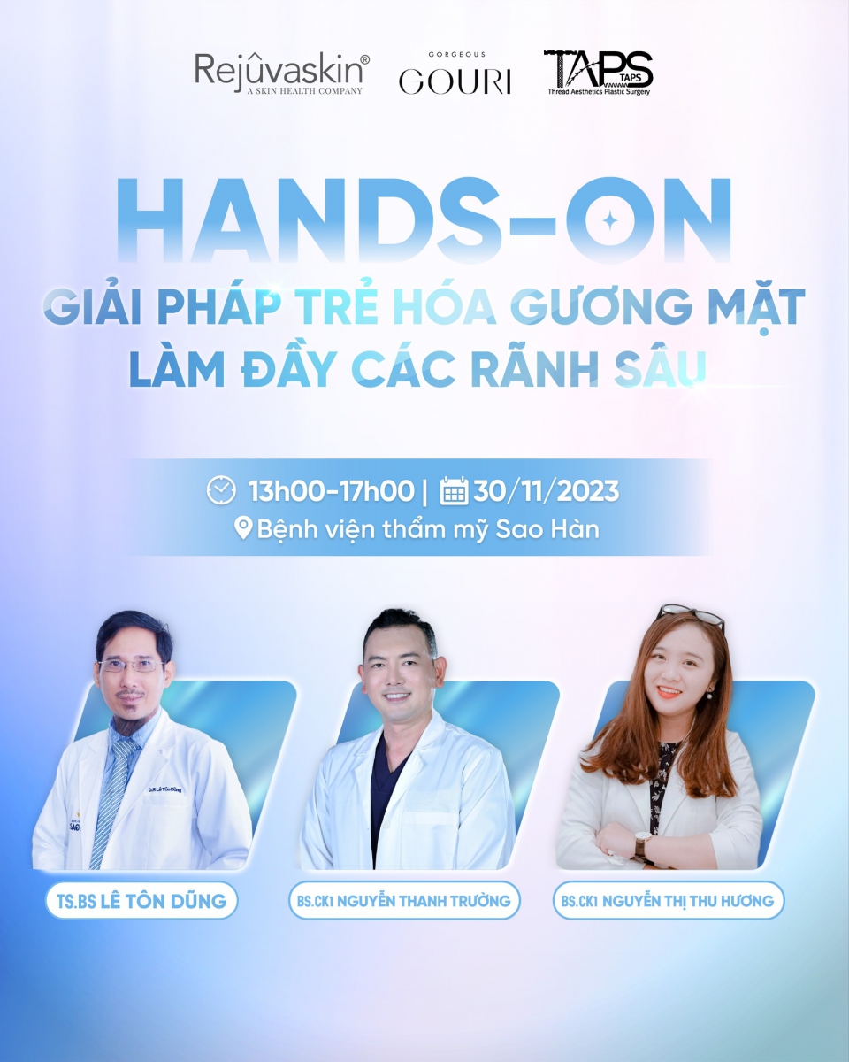 Hiểu được những trăn trở của các bác sĩ, thẩm mỹ viện, spa nhằm mang đến 1 làn da trẻ trung, tươi mới cho khách hàng bằng phương pháp căng chỉ da và tiêm PCL trẻ hoá, Rejuvaskin Việt Nam quyết định phối hợp cùng Gouri Việt Nam và TAPS tổ chức sự kiện Hands-On “Giải pháp trẻ hóa gương mặt và làm đầy rãnh sâu” tại Bệnh viện thẩm mỹ Sao Hàn mang đến hàng loạt giải pháp đột phá trẻ hóa gương mặt không phẫu thuật. Sự kiện chính là cơ hội để các bác sĩ, spa, thẩm mỹ viện cập nhật những phương pháp làm đẹp hiện đại, an toàn mang đến cho khách hàng 1 làn da thêm căng mịn, khắc phục tình trạng lão hóa.