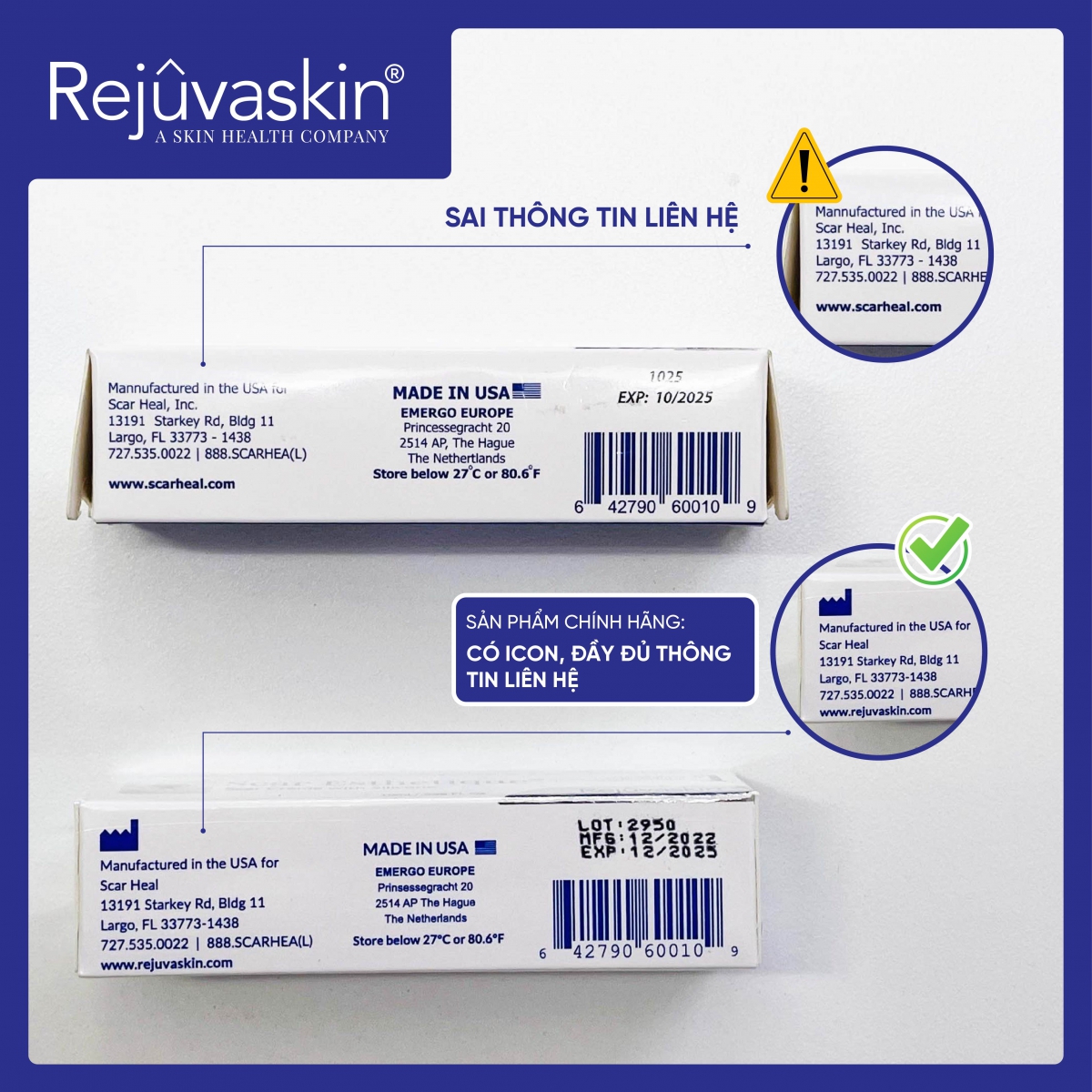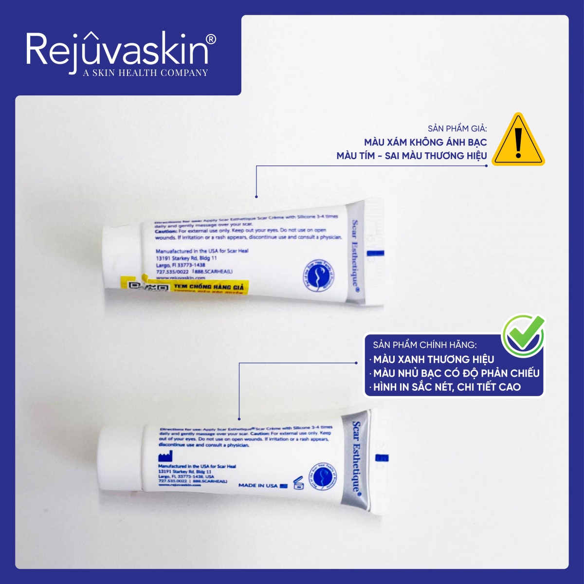Hiện nay trên thị trường đã xuất hiện tình trạng hàng giả, hàng nhái trong đó có kem làm mờ sẹo thâm, rỗ, lõm Scar Esthetique. Điều này sẽ gây ảnh hưởng nghiêm trọng đến sức khỏe làn da người dùng & uy tín của thương hiệu. Gần đây, Rejuvaskin Việt Nam đã tiếp nhận trường hợp hoàn trả đơn hàng không giống với các sản phẩm của công ty. Vì vậy, Rejuvaskin Việt Nam muốn thông báo cẩm nang nhận diện kem làm mờ sẹo thâm, rỗ, lõm Scar Esthetique chính hãng nhằm nâng cao cảnh giác, tránh mua phải hàng giả, hàng nhái.
