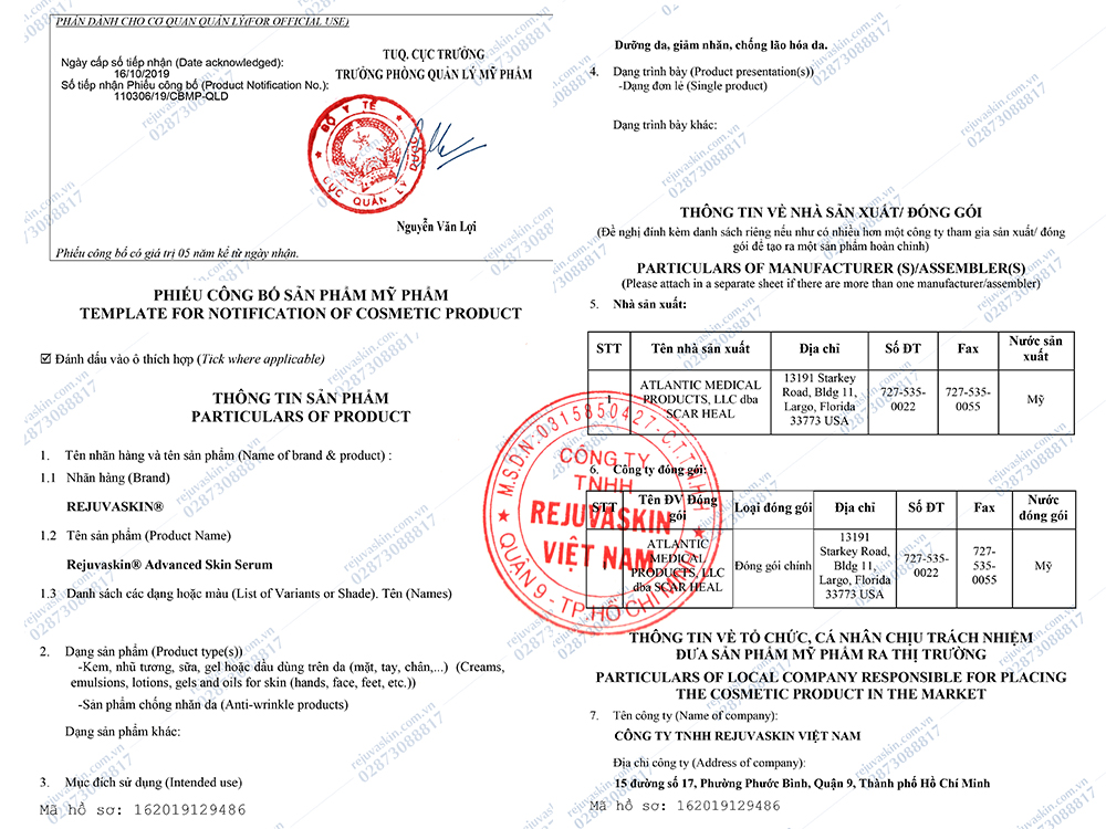 Phiếu công bố sản phẩm serum chống lão hóa Rejuvaskin