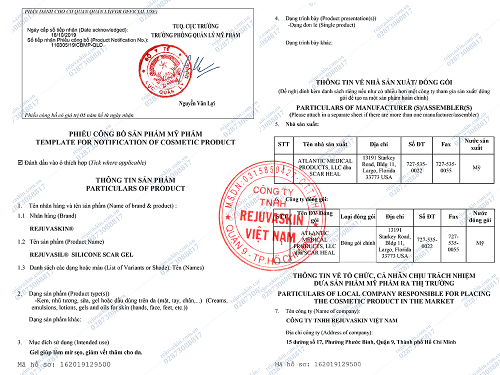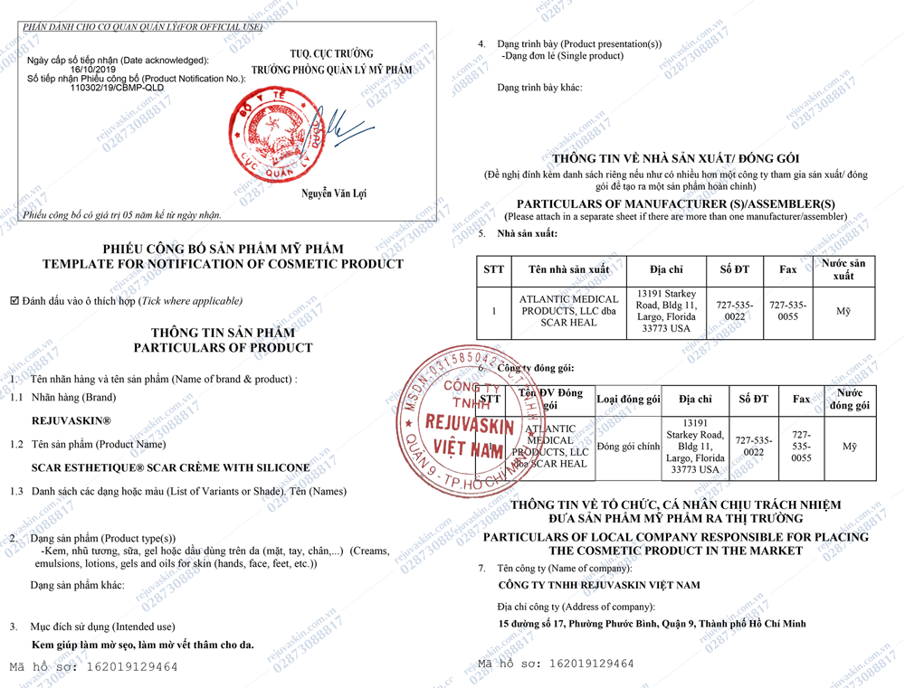Phiếu công bố sản phẩm gel xóa mờ sẹo lồi/phì đại Scar Rejuvaskin