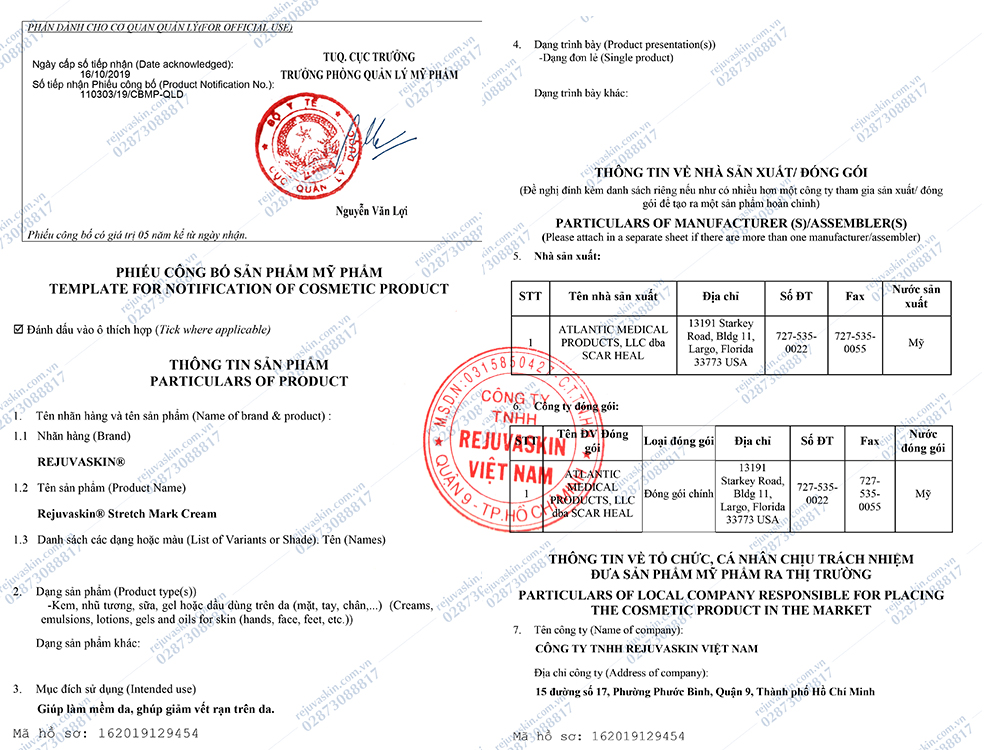 Phiếu công bố sản phẩm kem phòng ngừa và trị rạn da Rejuvaskin