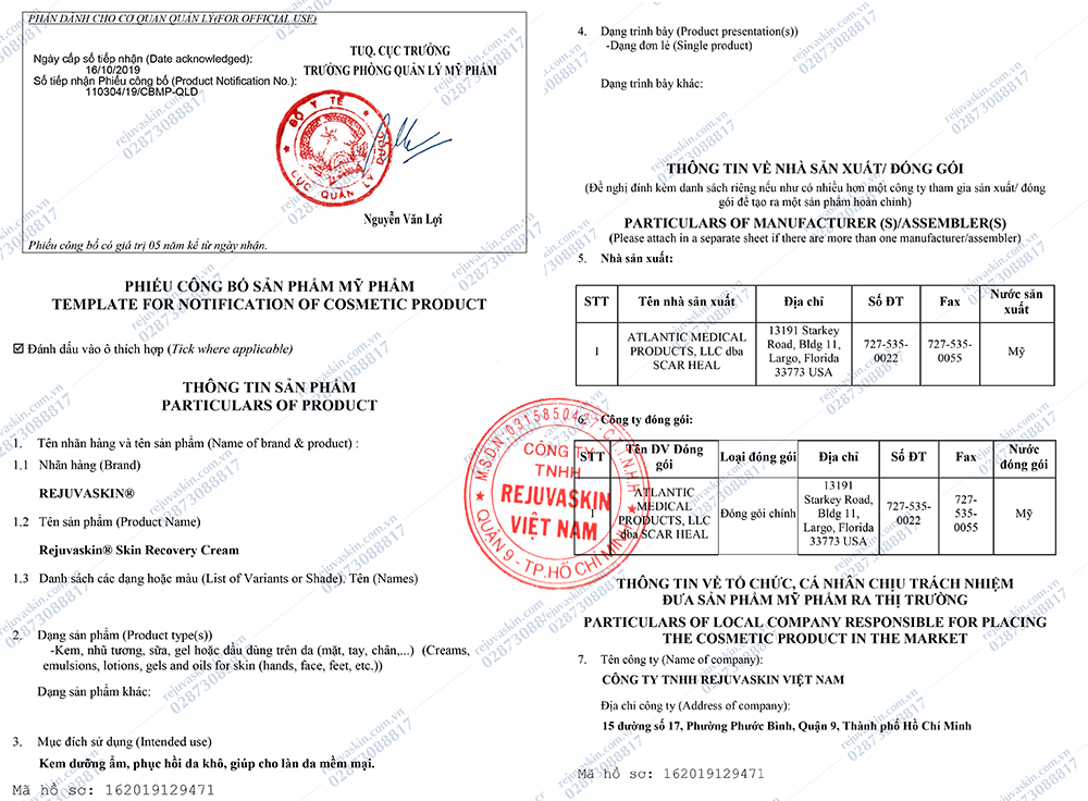 Phiếu công bố sản phẩm kem phục hồi da Rejuvaskin