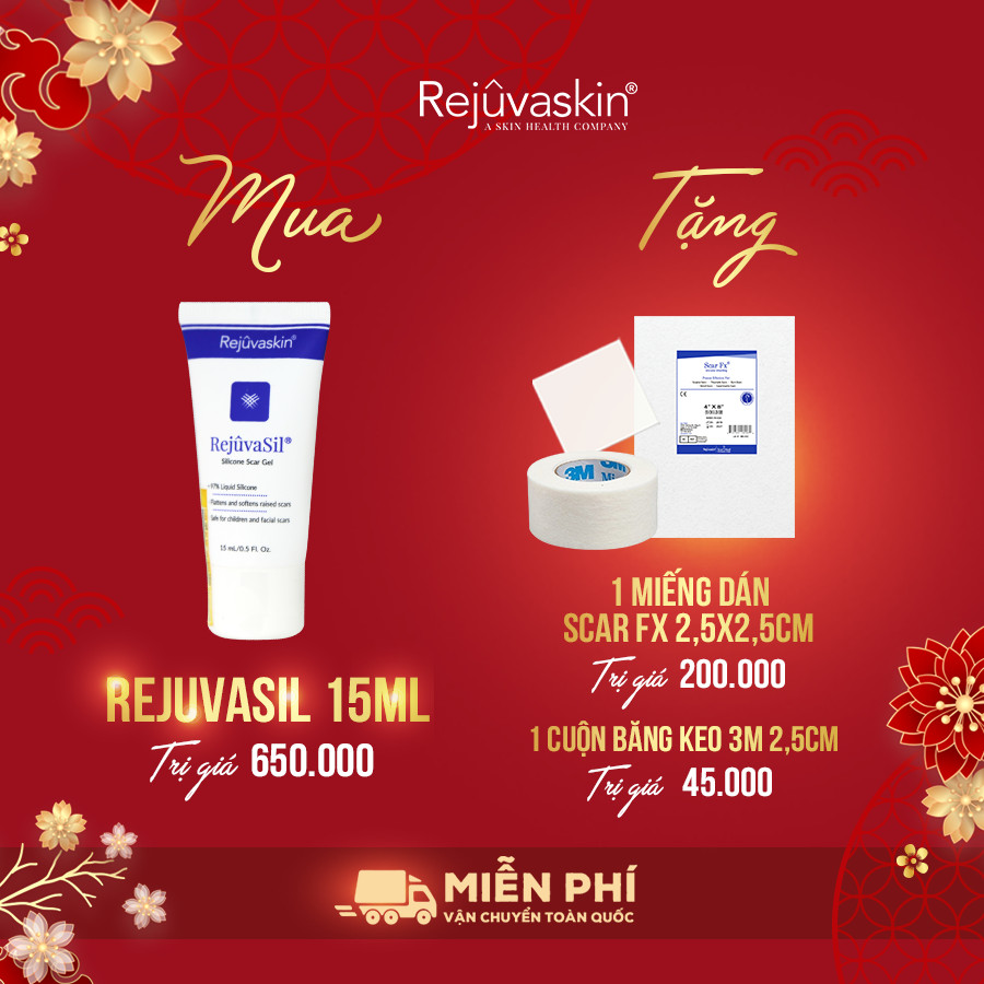 Mua gel Rejuvasil 15ml =>Tặng ngay 1 miếng dán Scar FX 2.5x2.5cm trị giá 200.000 vnđ + 1 cuộn băng keo y tế trị giá 45.000 vnđ.