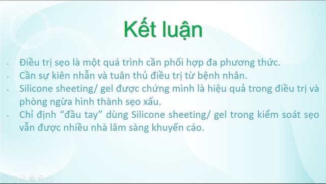 Kết thúc chuyên đề báo cáo, BS.CK1 Phùng Cao Cường kết luận việc làm mờ sẹo là một quá trình cần phối hợp đa phương thức, cần sự kiên nhẫn, tuân thủ từ bệnh nhân. Đặc biệt, Silicone sheeting/gel được chứng minh là hiệu quả trong điều trị và phòng ngừa hình thành sẹo xấu. Ngoài chuyên đề của BS.CK1 Phùng Cao Cường, Rejuvaskin Việt Nam còn mang đến trưng bày các sản phẩm quản lý, tối ưu sẹo với mong muốn các khách mời tại hội nghị và bệnh nhân đang điều trị tại bệnh viện hiểu hơn về sản phẩm cũng như chất lượng sản phẩm.