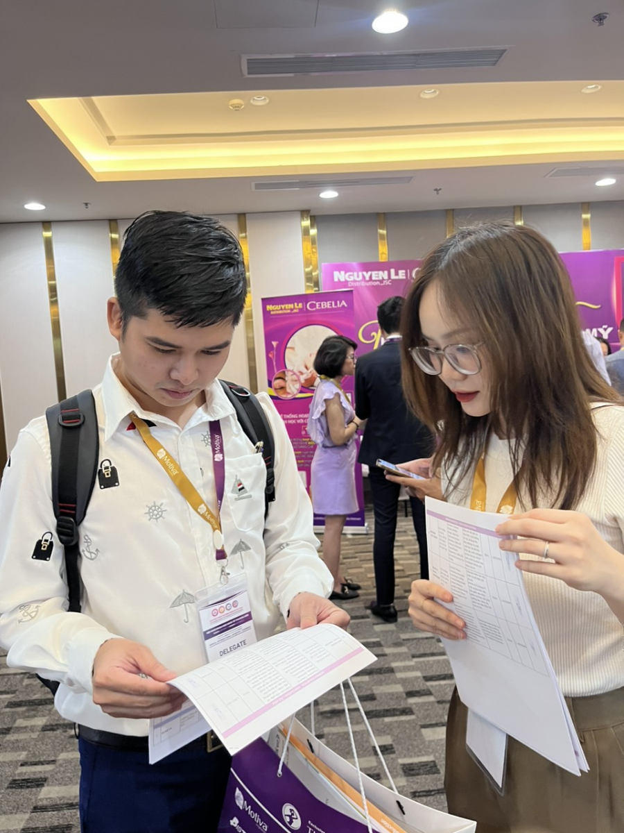 Đại diện Rejuvaskin Việt Nam (bên phải) chụp hình cùng ThS. Phan Minh Nhựt - Ban Thư ký - Đối ngoại hội nghị (bên trái)