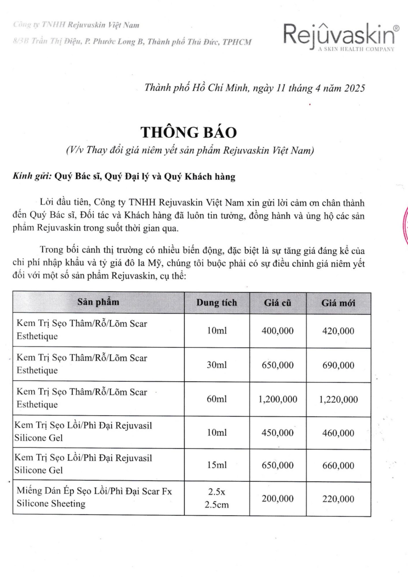 Rejuvaskin Việt Nam hiểu rằng việc điều chỉnh giá có thể ảnh hưởng đến Quý Bác sĩ, Quý Đối tác và Quý Khách hàng. Tuy nhiên, Ban Lãnh đạo Công ty đã cân nhắc kỹ lưỡng, đồng thời tối ưu mọi chi phí có thể nhằm đưa ra mức điều chỉnh thấp nhất, với mục tiêu vẫn đảm bảo mang đến các sản phẩm chất lượng cao – an toàn – hiệu quả cho người tiêu dùng Việt Nam.